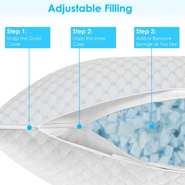 Filled with gel infused blue memory foam sponge,the cooling bed pillow provides personalized support to your head,neck and shoulders,relieving pain and enhancing your sleep,whether you're a side sleeper,stomach sleeper,or back sleeper. We also provide an extra bag of sponge,allowing you to customize the filling to suit your size,shape,or sleep position.