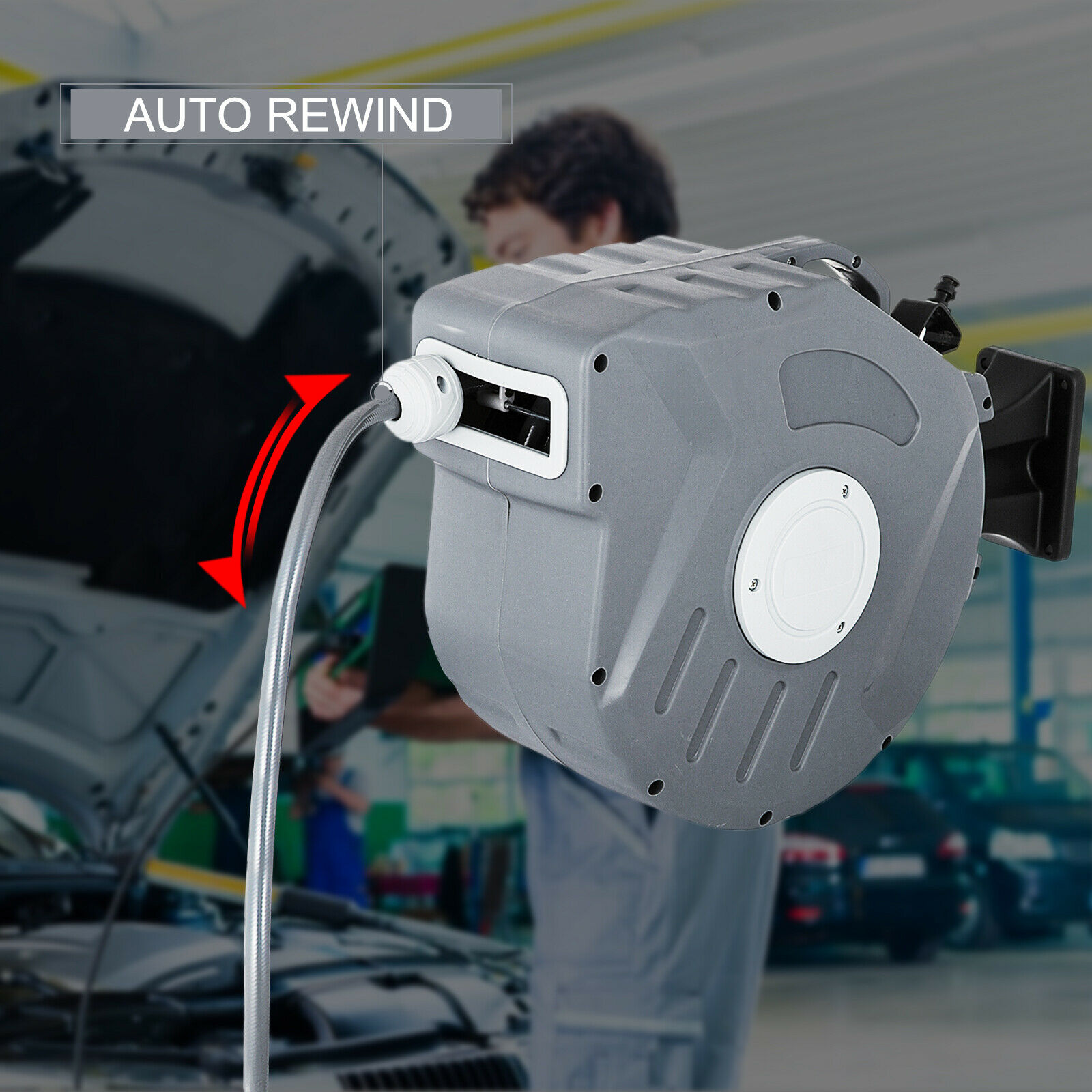 Convenient auto-rewind: When you're done, tap the hose hard to activate its auto-rewind feature. The automatic rewinding mechanism of this air compressor hose reel ensures a neat and even reel in the housing as it rewinds.