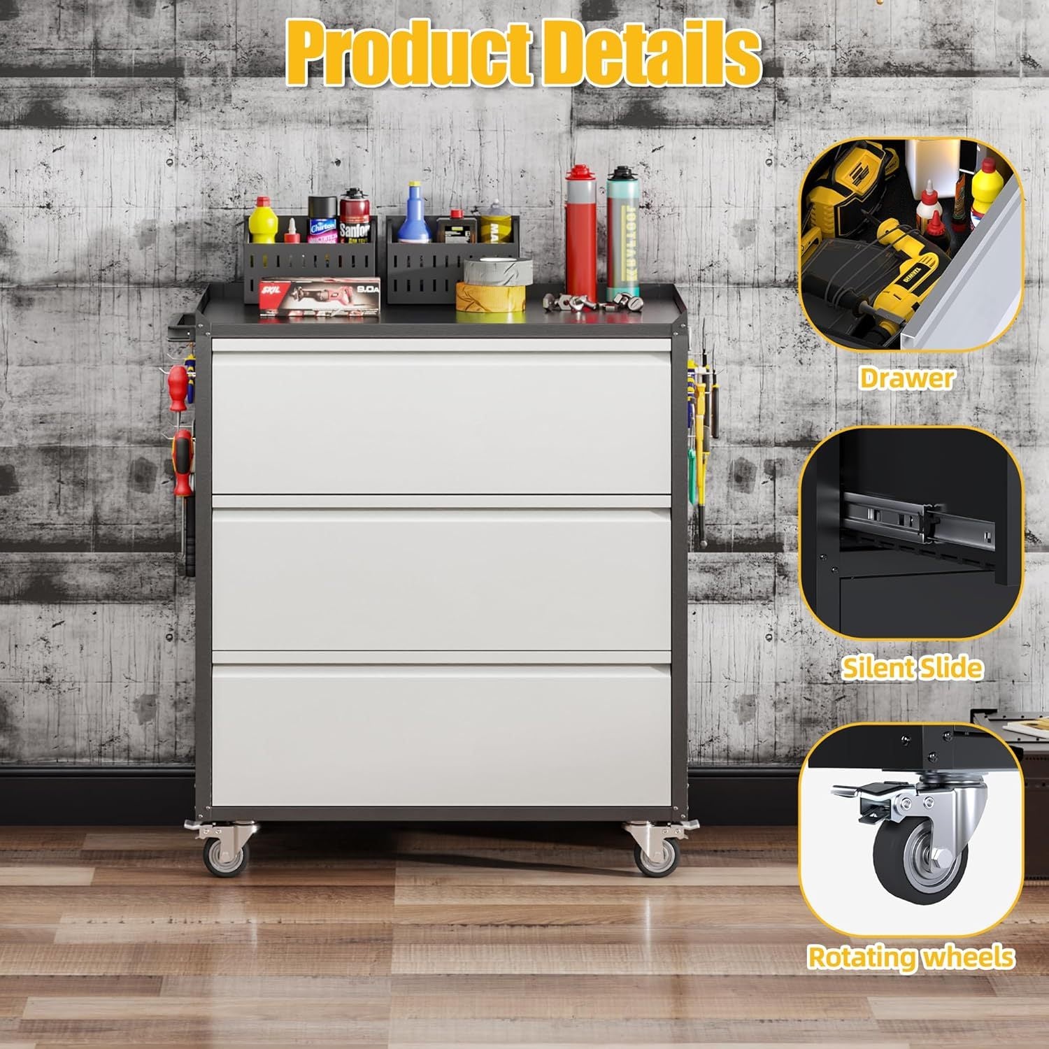Aobabo Metal Garage Tool Storage Cabinets With Wheels, Steel Cabinet With Drawer, 3 Drawers Rolling Tools Chest Cabinet For Garage, Warehouse, Assembly Required, Black Grey