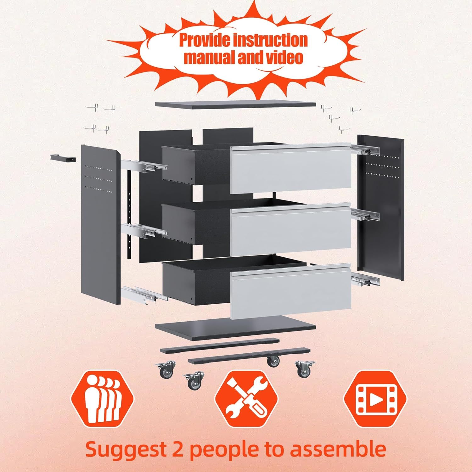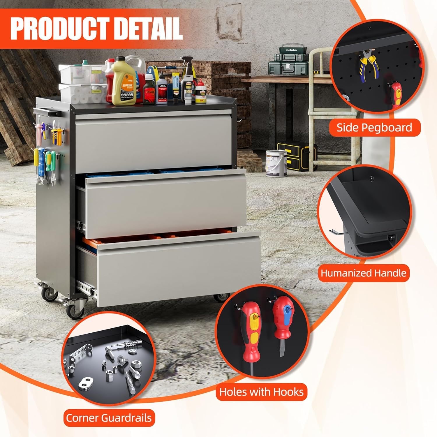 Aobabo Tool Storage Garage Cabinet With Wheels, 3 Drawer Tool Chest Rolling Metal Storage Cabinet On Wheels, Assembly Required, Black Gray