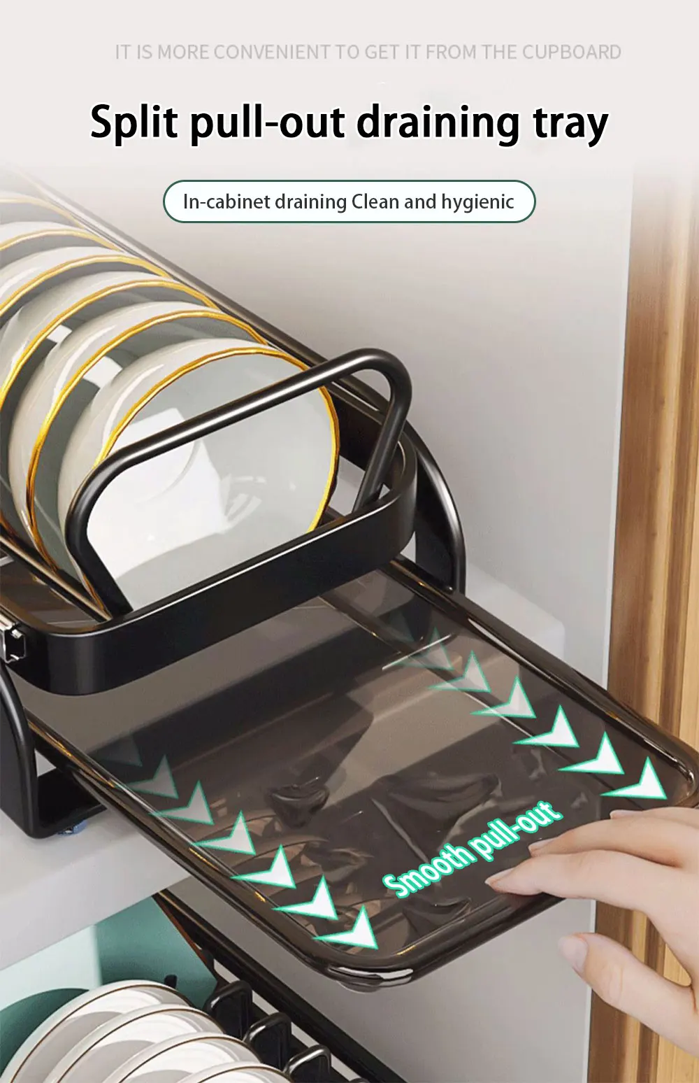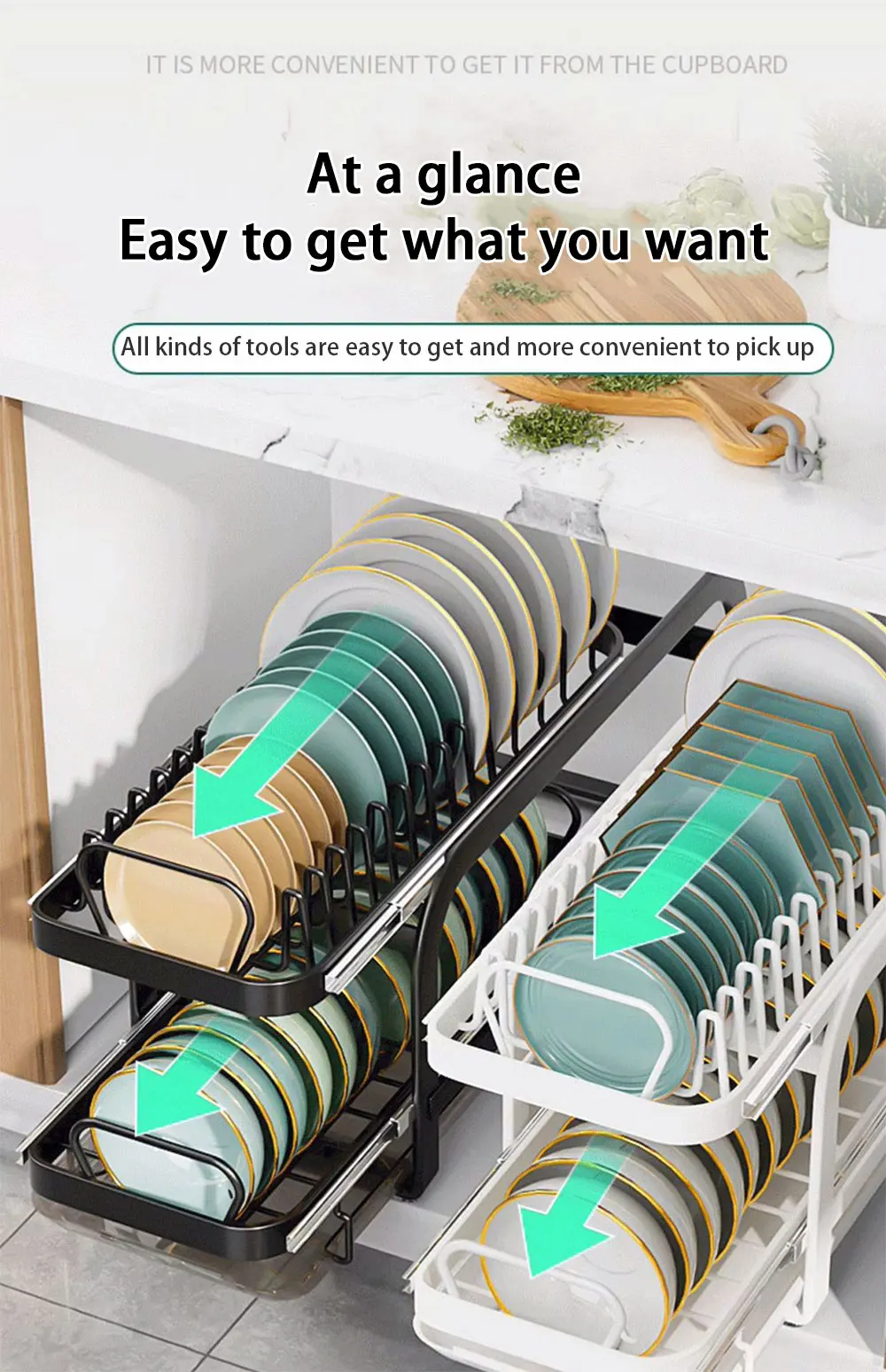 【Smooth Sliding Drawer with Wheels】: The dish rack's drawer features smooth-sliding functionality with built-in wheels, allowing for easy access to your dishes and kitchenware. Enjoy hassle-free organization and retrieval of items with the sliding drawer design.