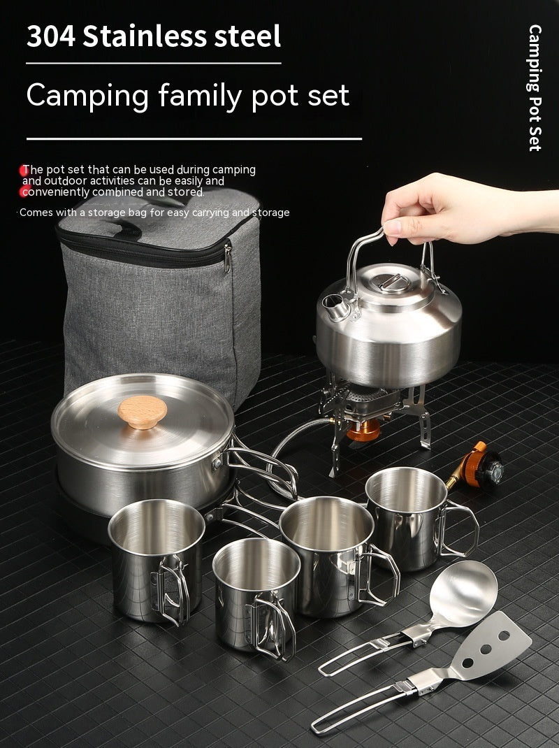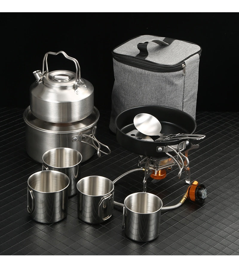 Color: outdoor cookware 8-piece set (free buggy bag), outdoor windproof gas stove (with Box storage),17CM wooden lid collapsible pot, 17CM frying pan, buggy bag, 1L kettle