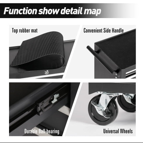 - Large Storage Space: The tool cart is equipped with 5+2 drawers of different sizes, and a large storage space on the bottom. The top storage rack provides additional space for arranging the workshop accessories you need